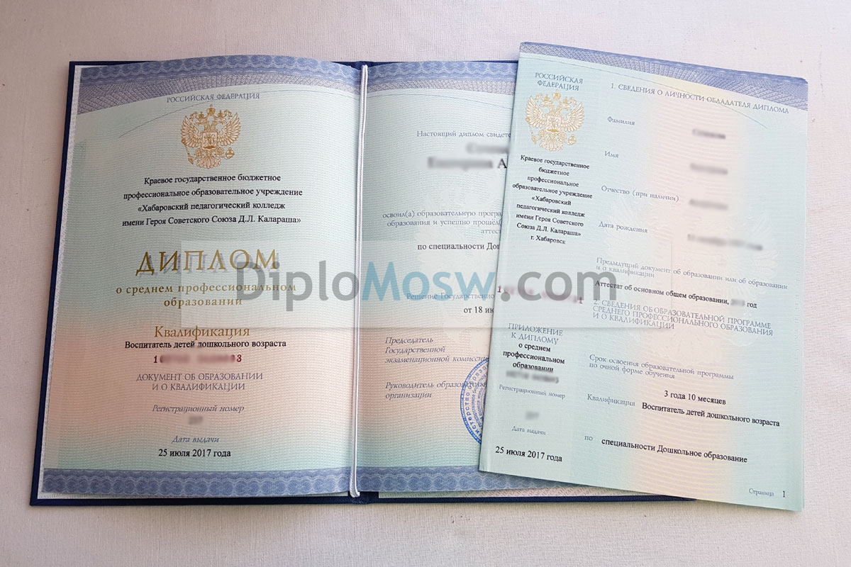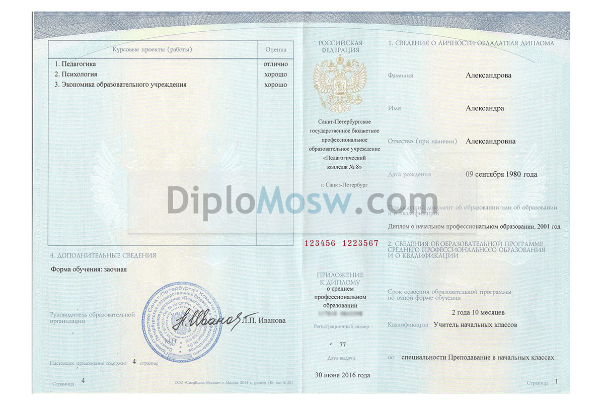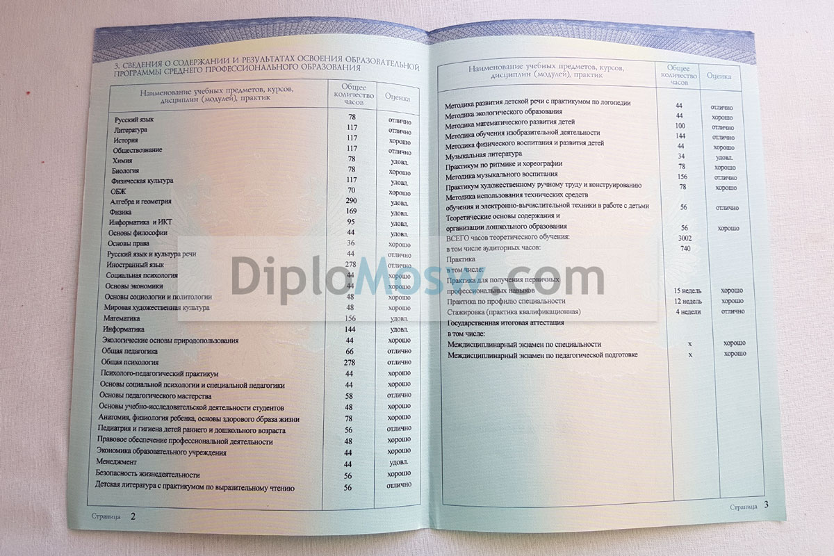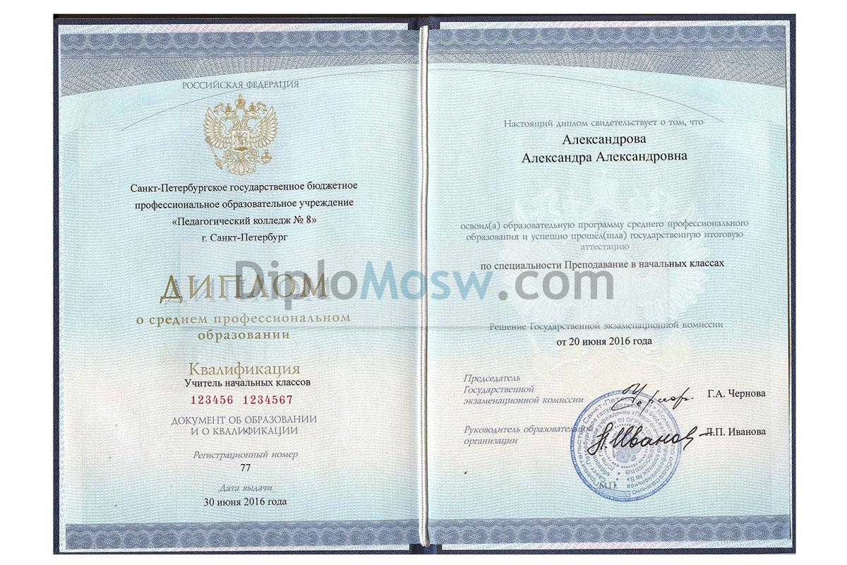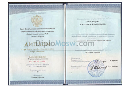 Ниже представлены дипломы нового образца о среднем профессиональном образовании по направлениям «Учитель начальных классов» и «Воспитатель детей дошкольного возраста» из разных российских ссузов.